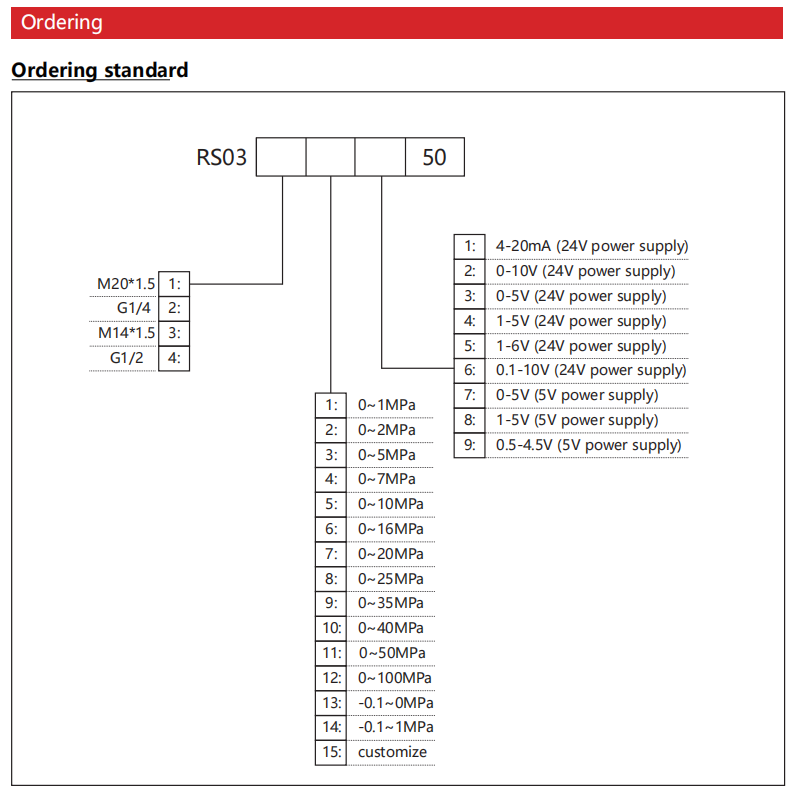 different output signals, absolute or gauge (relative) versions, measurement ranges from -0.1 to 0