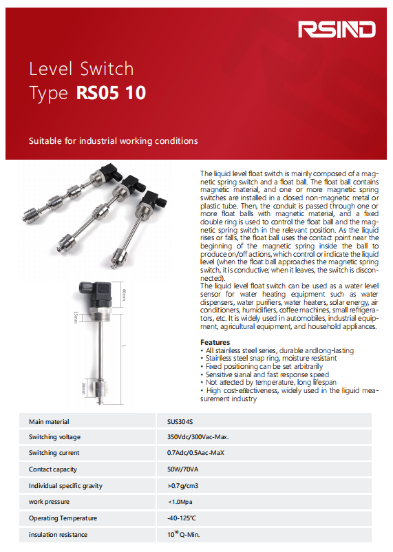 The liquid level float switch is mainly composed of a magnetic spring switch and a float ball. The float ball contains magnetic material, and one or more magnetic spring switches are installed in a closed non-magnetic metal or plastic tube. Then, the conduit is passed through one or more float balls with magnetic material, and a fixed double ring is used to control the float ball and the magnetic spring switch in the relevant position. As the liquid rises or falls, the float ball uses the contact point near the beginning of the magnetic spring inside the ball to produce on/off actions, which control or indicate the liquid level (when the float ball approaches the magnetic spring switch, it is conductive; when it leaves, the switch is disconnected). The liquid level float switch can be used as a water level sensor for water heating equipment such as water dispensers, water purifiers, water heaters, solar energy, air conditioners, humidifiers, coffee machines, small refrigerators, etc. It is widely used in automobiles, industrial equipment, agricultural equipment, and household appliances.