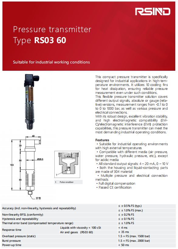 This compact pressure transmitter is specifically  designed for industrial applications in high-temperature environments. It utilizes 10 cooling fins  for heat dissipation, ensuring reliable pressure  measurement even under such conditions. This flexible pressure transmitter solution covers  different output signals, absolute or gauge (relative) versions, measurement ranges from -0.1 to 0  to 0 to 1000 bar, as well as various pressure and  electrical connections. With its robust design, excellent vibration stability,  and high electromagnetic compatibility (EMC)/electromagnetic interference (EMI) protection  capabilities, this pressure transmitter can meet the  most demanding industrial operating conditions.