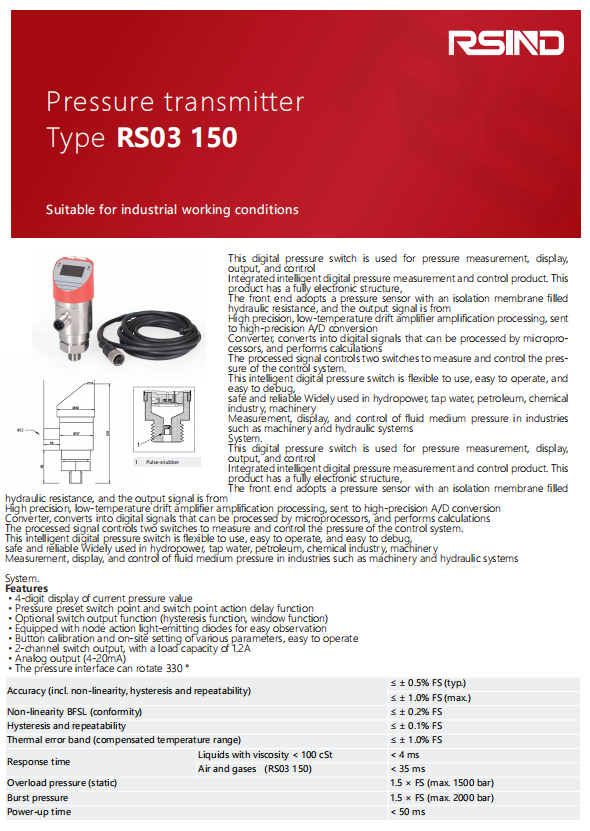 This digital pressure switch is used for pressure measurement, display, output, and control Integrated intelligent digital pressure measurement and control product. This product has a fully electronic structure, The front end adopts a pressure sensor with an isolation membrane filled hydraulic resistance, and the output signal is from High precision, low-temperature drift amplifier amplification processing, sent to high-precision A/D conversion Converter, converts into digital signals that can be processed by micropro- cessors, and performs calculations The processed signal controls two switches to measure and control the pres- sure of the control system. This intelligent digital pressure switch is flexible to use, easy to operate, and easy to debug, safe and reliable Widely used in hydropower, tap water, petroleum, chemical industry, machinery Measurement, display, and control of fluid medium pressure in industries such as machinery and hydraulic systems System.