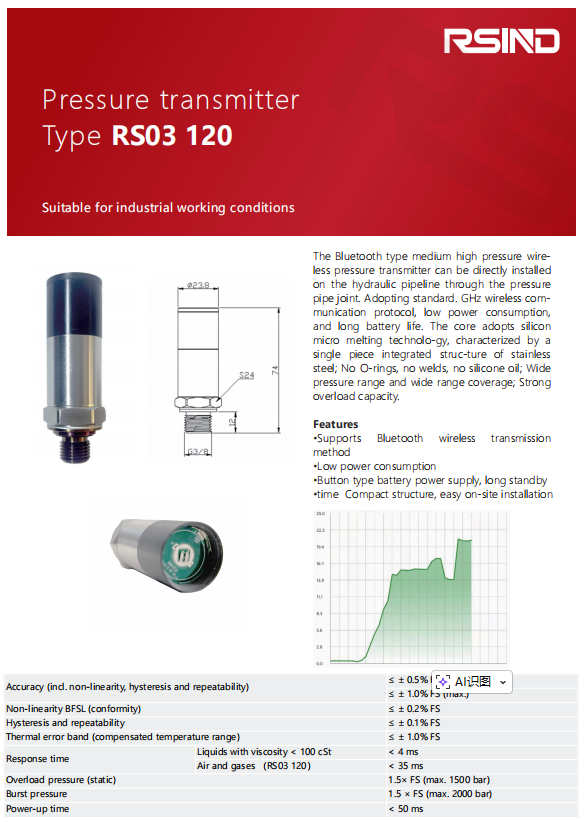The Bluetooth type medium high pressure wireless pressure transmitter can be directly installed on the hydraulic pipeline through the pressure pipe joint. Adopting standard. GHz wireless communication protocol, low power consumption, and long battery life. The core adopts silicon micro melting technolo-gy, characterized by a single piece integrated struc-ture of stainless steel; No O-rings, no welds, no silicone oil; Wide pressure range and wide range coverage; Strong overload capacity.