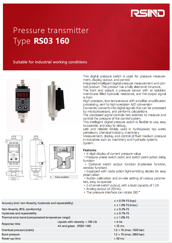 This digital pressure switch is used for pressure measurement, display, output, and control Integrated intelligent digital pressure measurement and control product. This product has a fully electronic structure, The front end adopts a pressure sensor with an isolation membrane filled hydraulic resistance, and the output signal is from High precision, low-temperature drift amplifier amplification processing, sent to high-precision A/D conversion Converter, converts into digital signals that can be processed by micropro- cessors, and performs calculations The processed signal controls two switches to measure and control the pres- sure of the control system. This intelligent digital pressure switch is flexible to use, easy to operate, and easy to debug, safe and reliable Widely used in hydropower, tap water, petroleum, chemical industry, machinery Measurement, display, and control of fluid medium pressure in industries such as machinery and hydraulic systems System.