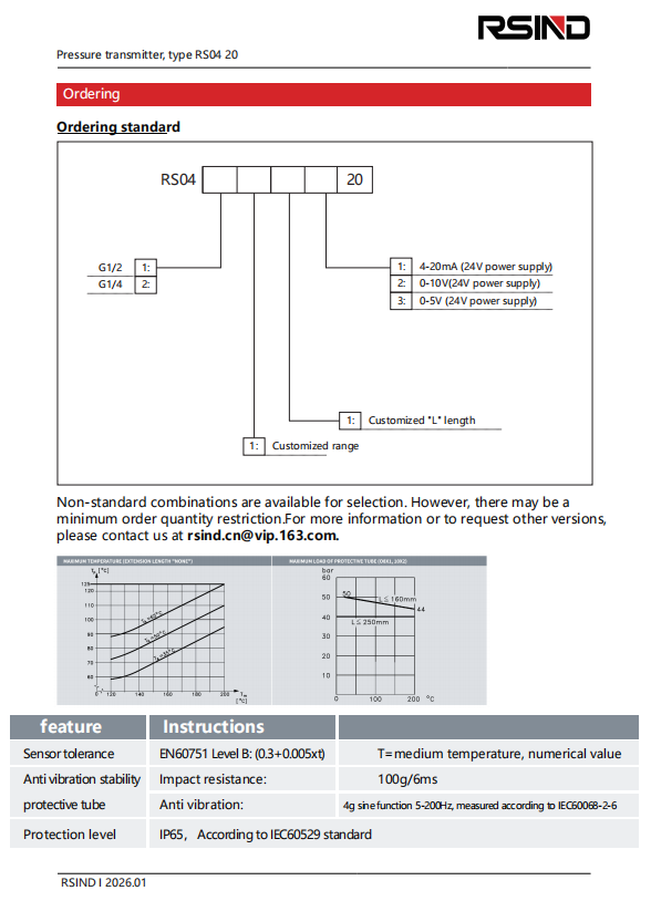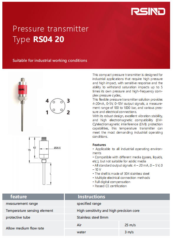 This temperature sensor is used in general industrial applications to control cooling water, lubricating oil, hydraulic oil, and refrigeration equipment. Using standard Pt 100 or Pt 1000 components can ensure the reliability and accuracy of measurements. It has multiple installation threads and electrical plugs, ensuring wide compatibility. The temperature range can be specified, such as -50 ℃~100 ℃ or 0 ℃~200 ℃, which is very wide. The measurement plug is based on a silicone cable, making the sensor very earthquake resistant. Made of stainless steel material, it is more stable and long-lasting.