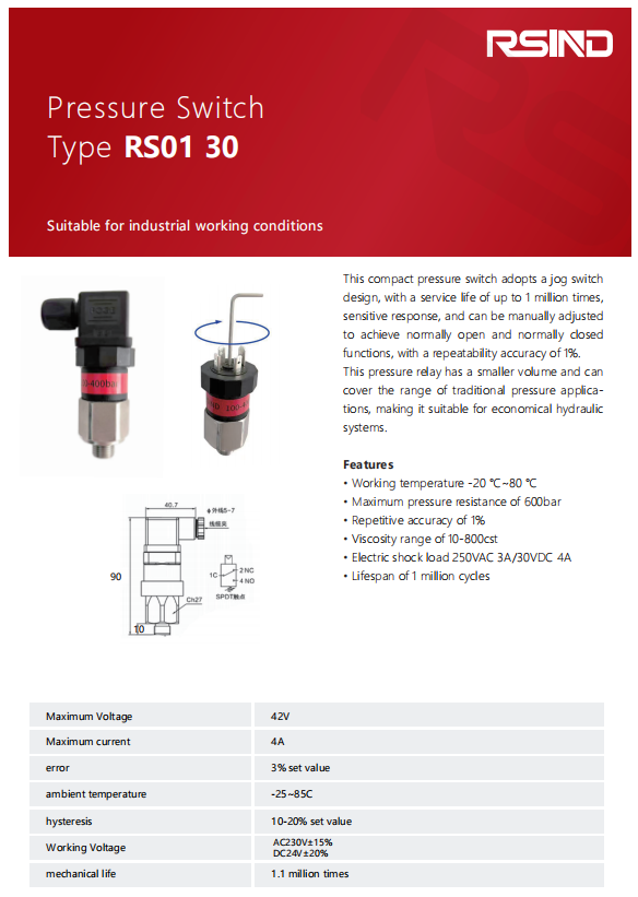 This compact pressure switch adopts a micro switch design, with a service life of up to 1 million times, sensitive response, and can be manually adjusted to achieve normally open and normally closed functions, with a repeatability accuracy of 1%. This pressure relay can cover the range of conventional pressure applications and is suitable for economical hydraulic systems.